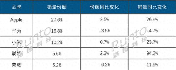 线上销量TOP5品牌榜单正式揭晓,苹果、华为、小米(含红米)、联想、荣耀稳居前列。